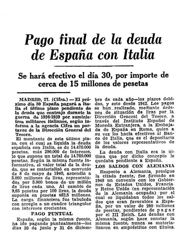Font: Sàpiens Mussolini no ho va dubtar ni un moment: havia d’ajudar Franco. L’aportació bèl·lica de la Itàlia feixista va decidir la victòria franquista. Però tot tenia un preu: concretament 5.000 milions de lires. ‘Sàpiens’ publica, per primer cop, uns documents reveladors localitzats per l’historiador Andrea Tappi que demostren que, un cop caigut el Duce,… Continueu llegint Mussolini tenia un preu
